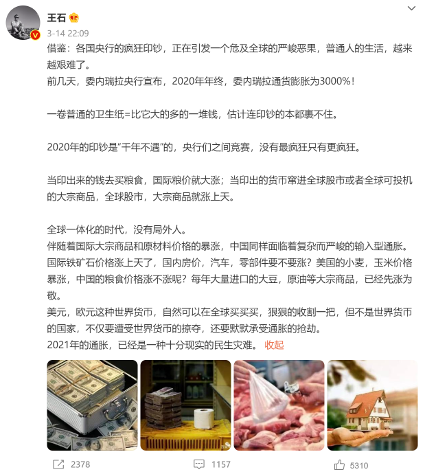 王石:全球一体化时代,没有局外人,2021年大通胀是民生灾难